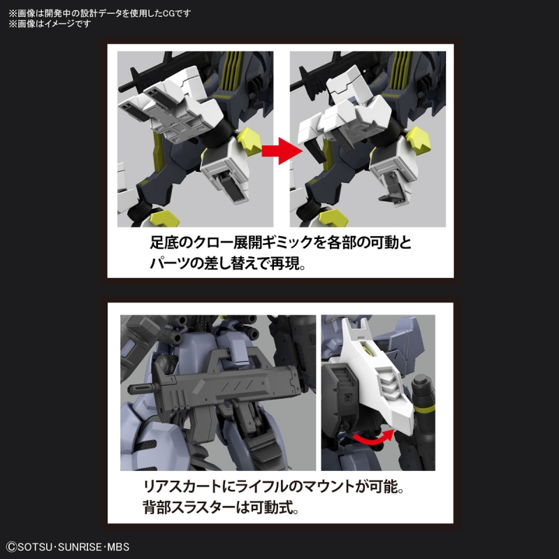 From Mobile Suit Gundam Iron-Blooded Orphans Urzu Hunt, Gundam Asmodeus is three-dimensionalized for the first time! In addition to new exterior parts, the appearance shape is reproduced by partially new construction of the Gundam frame. The development gimmick of the claw on the sole of the foot is expressed by moving each part and replacing parts. Reproduce the expansion and contraction gimmick of Gran Tonfa on the arm by replacement. Gigant Javelin anchor gimmick is expressed by lead wire. A rifle can be mounted on the rear skirt. The back thruster is movable.