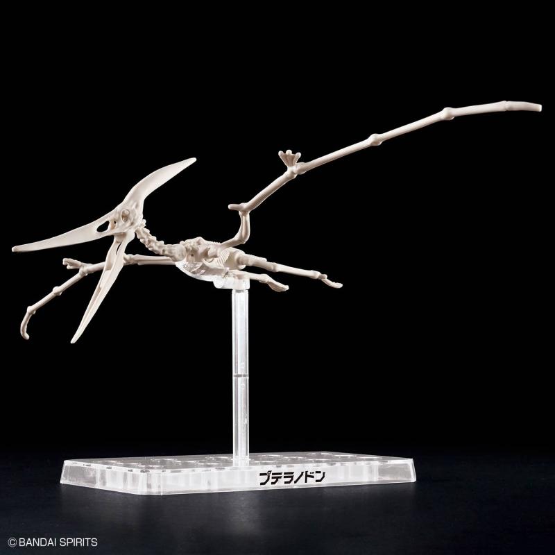 The Pteranodon's gigantic beak, which has a delicate skeleton covered with tough keratin, is three-dimensionalized based on the latest theory, including the structure of its mouth. The wing membrane realistically expresses the flow of muscular fibers on its surface, and the pterosaur-specific wing bones, which are said to have been used as elevators, are recreated using the latest construction. The special skeletal structure that allows the shoulder blades and torso vertebrae to form joints and create powerfully flapping wings has also been faithfully reproduced. You can even recreate the Pteranodon's distinctive "landing" position by selecting parts! It is possible to reproduce the wrinkles in the wing membrane when the wings are folded, and the state in which the feet are in contact with the heel on the ground. A base is included to display it in flight, too. Order this amazing model kit for your own collection today!