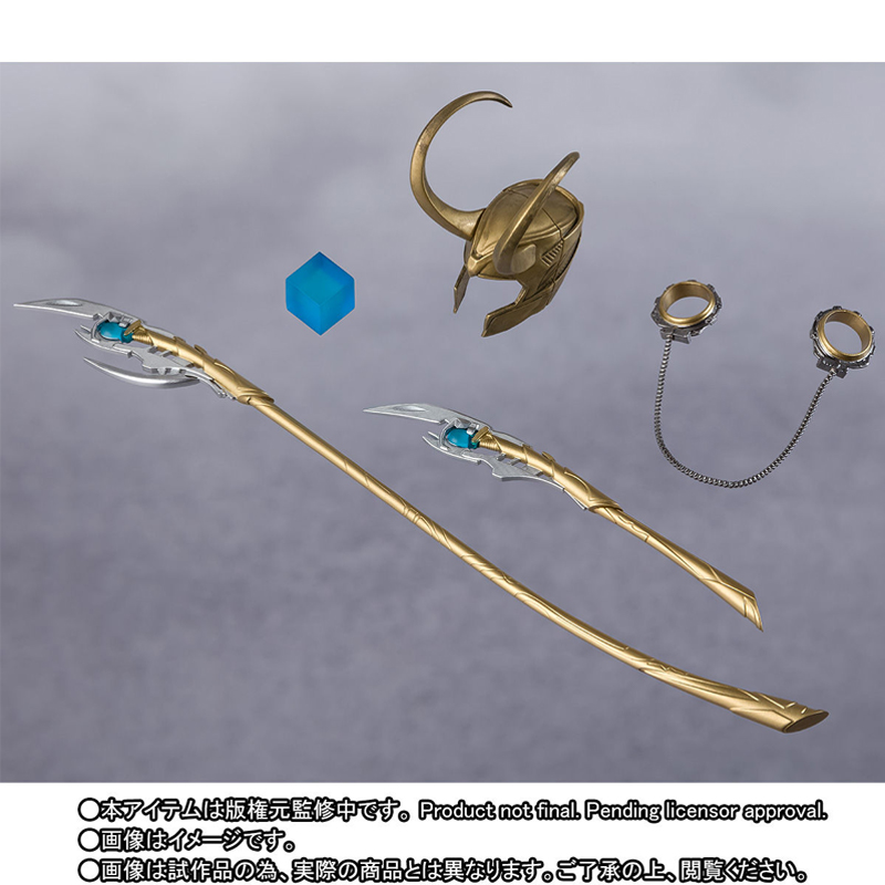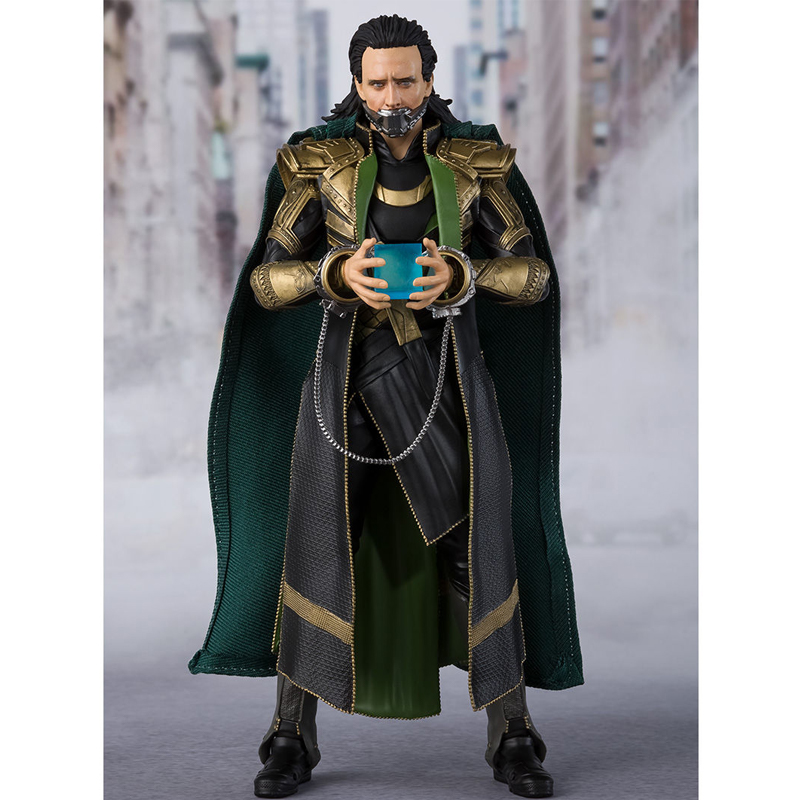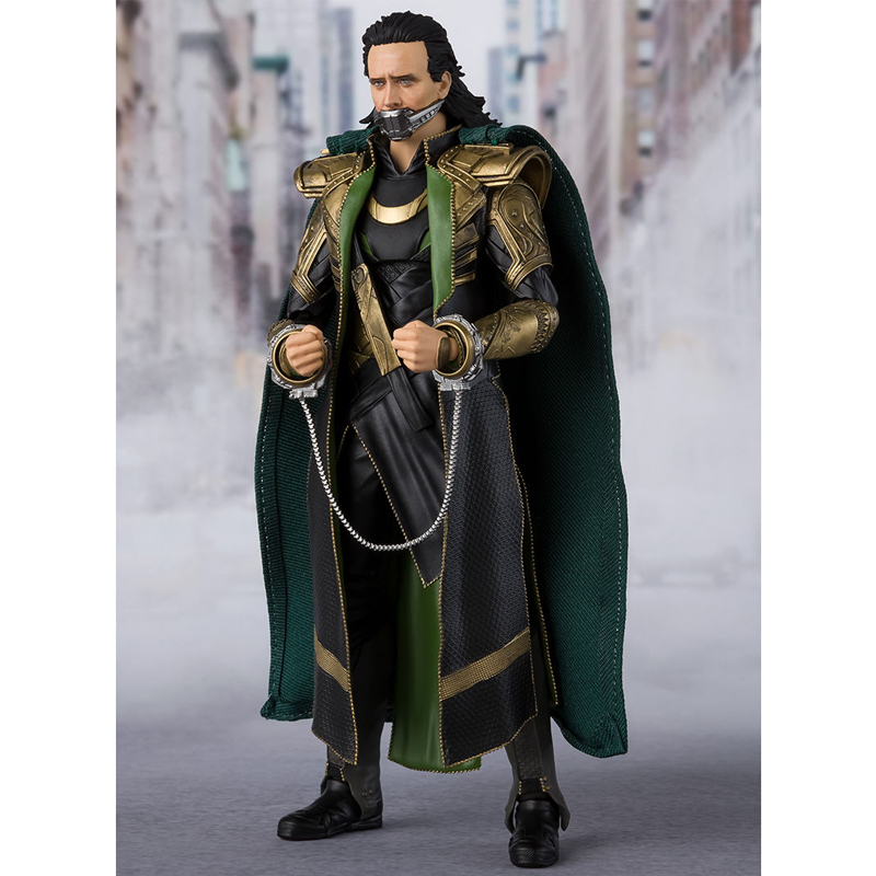 Loki joins S.H.Figuarts in his armored look from \"Avengers\"! In addition to the handcuffs and mouth restraint that replicate the scene where he was captured, a variety of optional parts are included, such as his staff (extended/stored), the Tesseract, and an optional mischievous smirk face part.